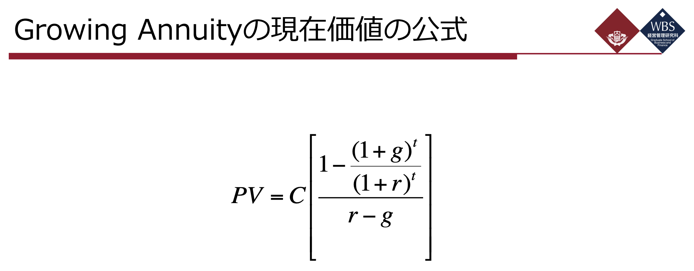 PV = C [ { 1 - ( 1 + g )^t / ( 1 + r )^t } / ( r - g ) ]