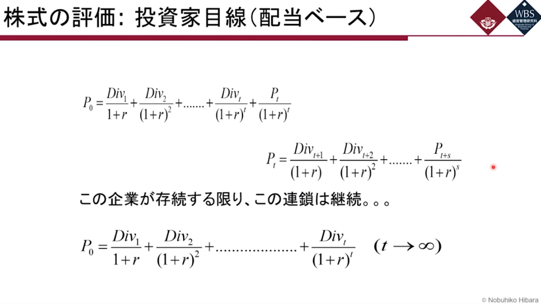 P(0) = Div(1) / (1+r) + Div(2) / (1+r)^2 + ... + Div(t) / (1+r)^t (t → ∞)
