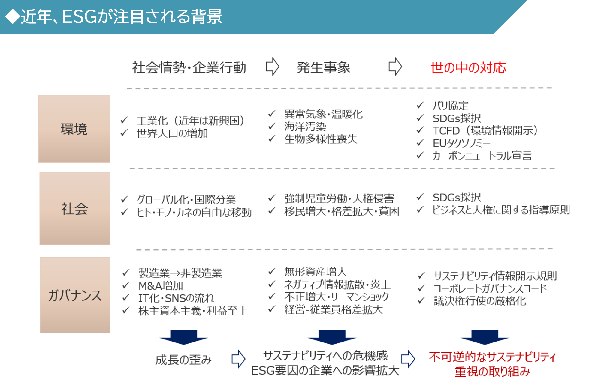사회정세, 기업행동 => 발생사건 => 세계의 대응