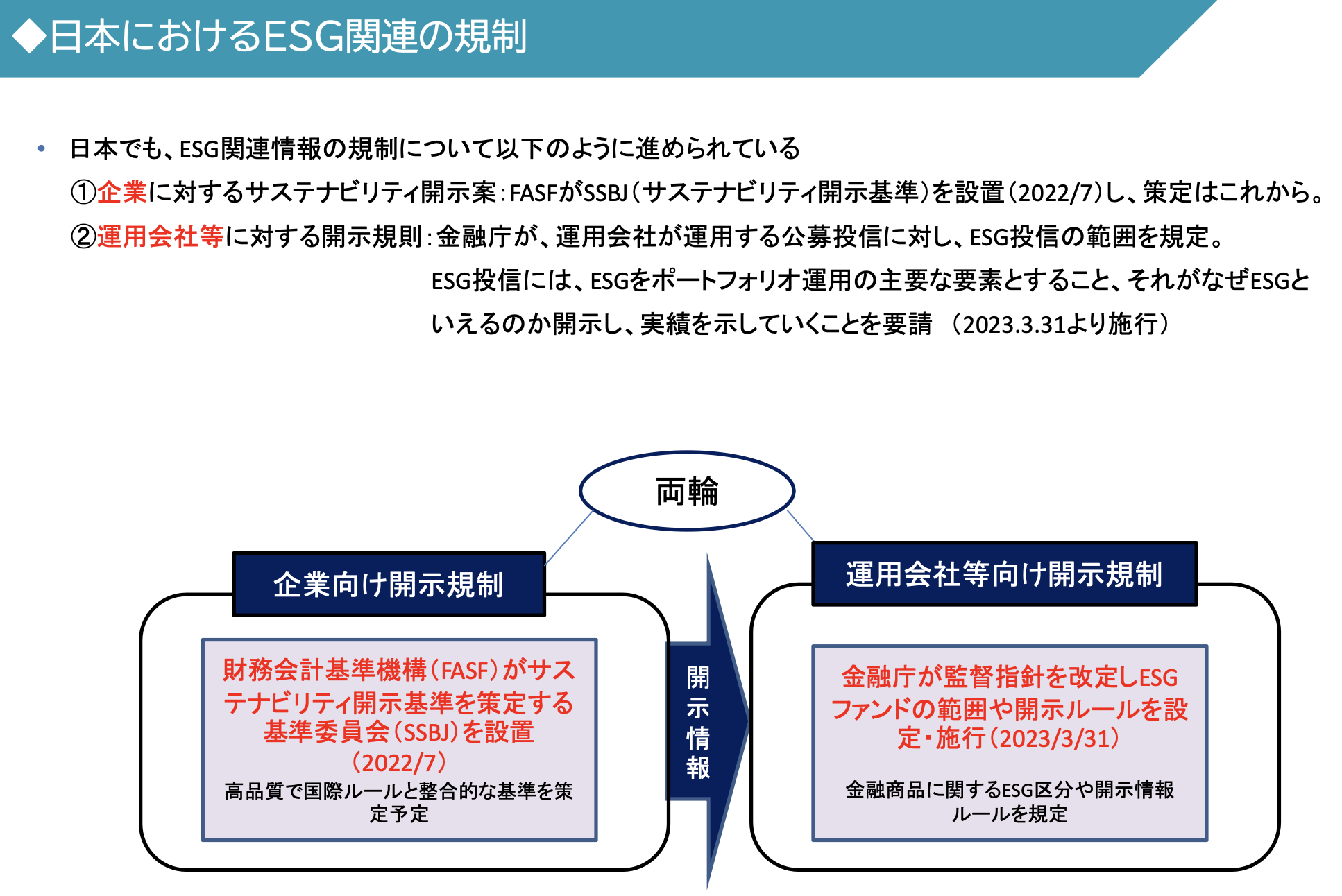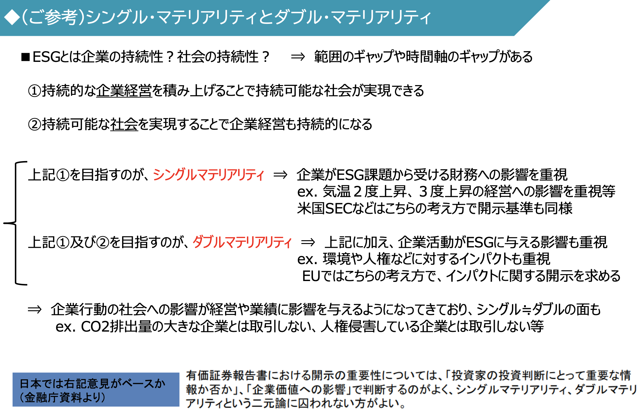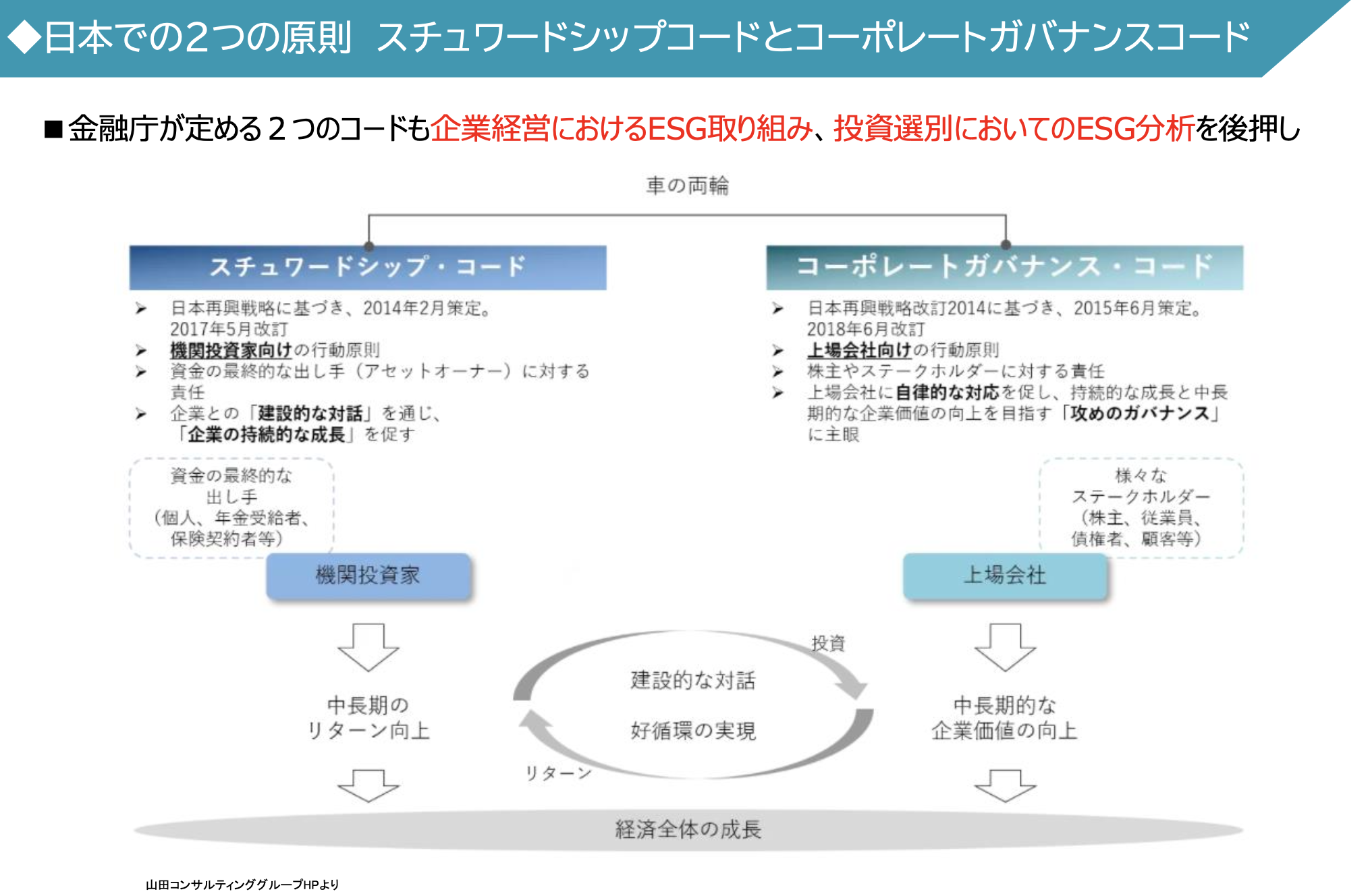 - 금융청이 정하는 2개의 Code도 기업경영에 있어서 ESG의 포함, 투자선별에 있어서의 ESG 분석을 밀고 있음