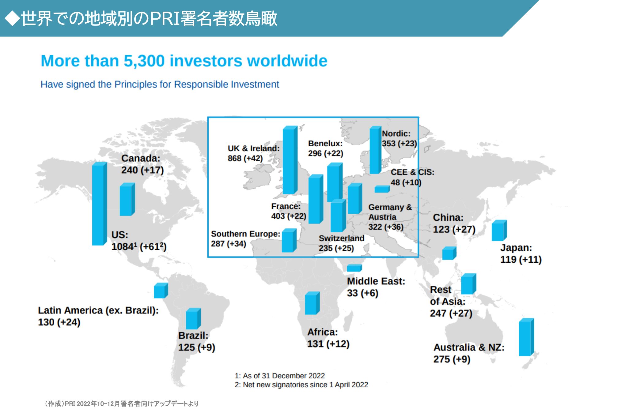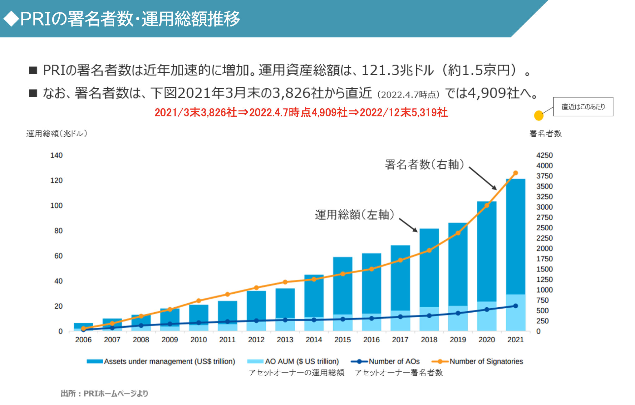 - PRI 서명자수는 최근 가속적으로 증가. 운용자산총액은, 121.3조 달러(약1.5경엔)