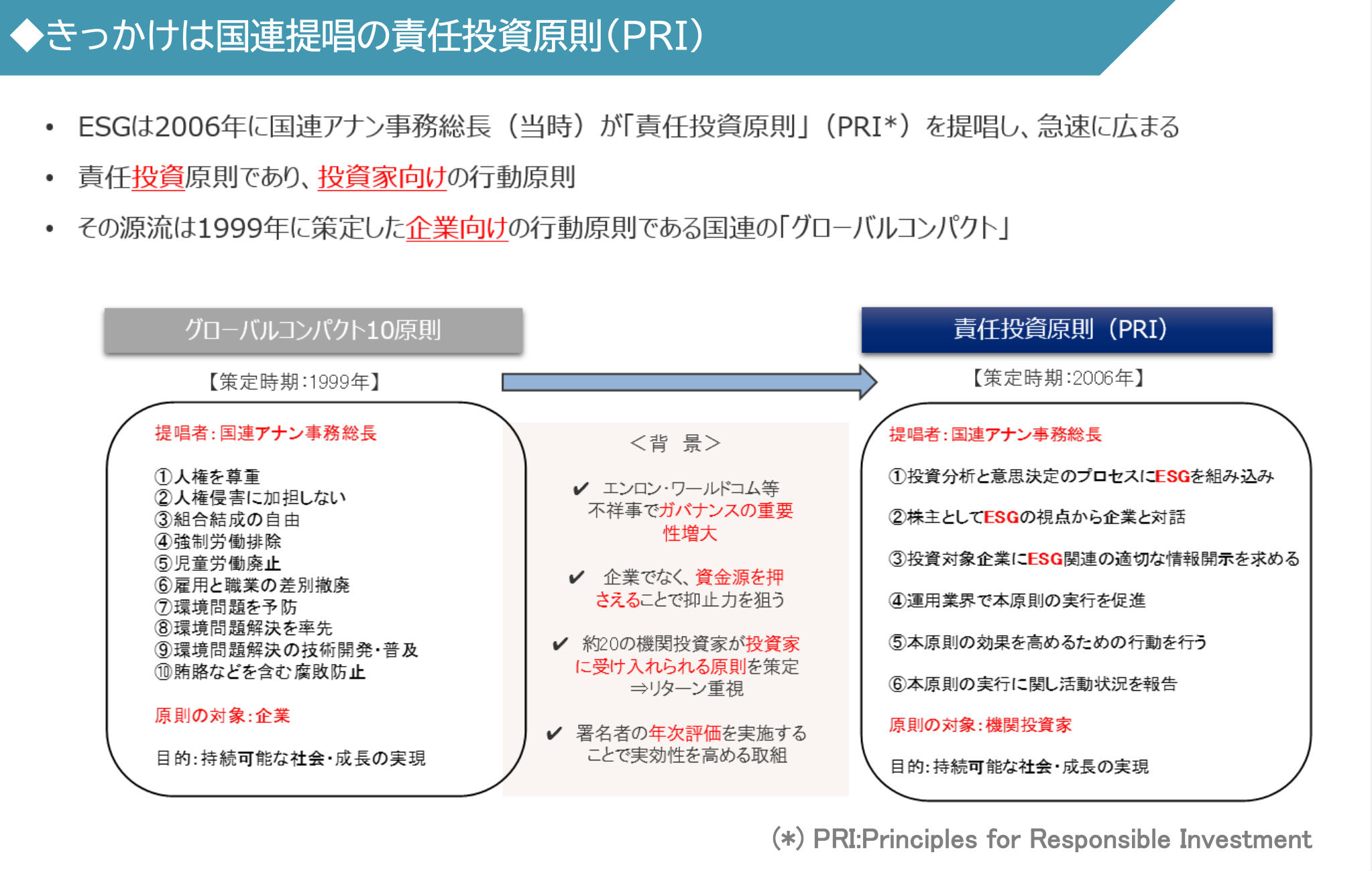 ESG는 2006년 국련 아난 사무총장이 [책임투자원칙] (PRI)를 제창, 급속도로 확장