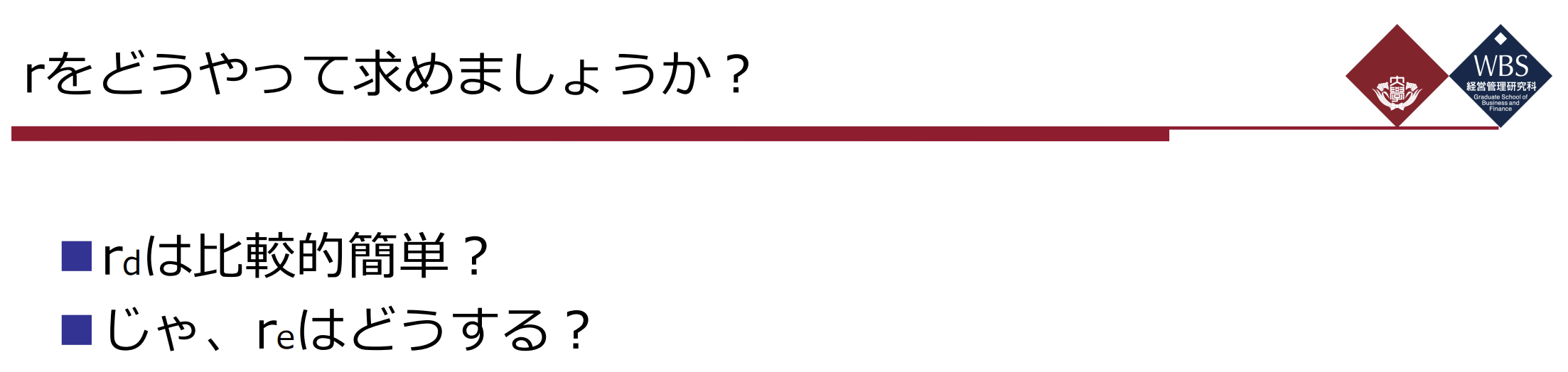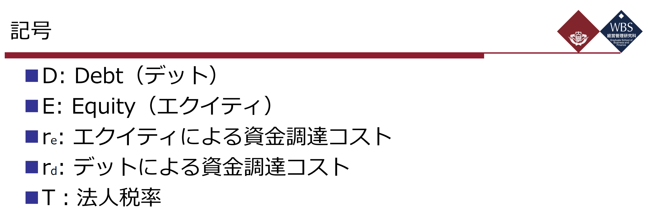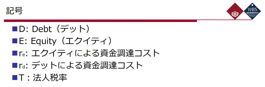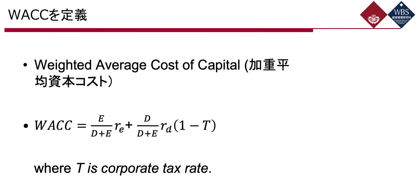 - WACC = { E / (D+E) } r(e) + { D / (D+E) } r(d) x (1 - T)
