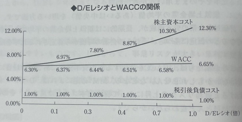 D/E ratio의 상승에 따라, 주주자본 Cost도 상승하고 있는 것에서, WACC은 거의 바뀌지 않는 것을 알 수 있다.
