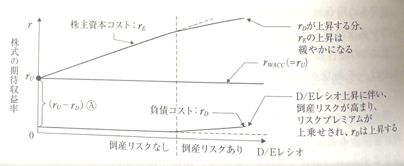 그 결과, Debt이 없는 r(U)와의 차 r(U) - r(D) 가 감소하여, 주주자본 Cost r(E)는 그만큼 완화된다.