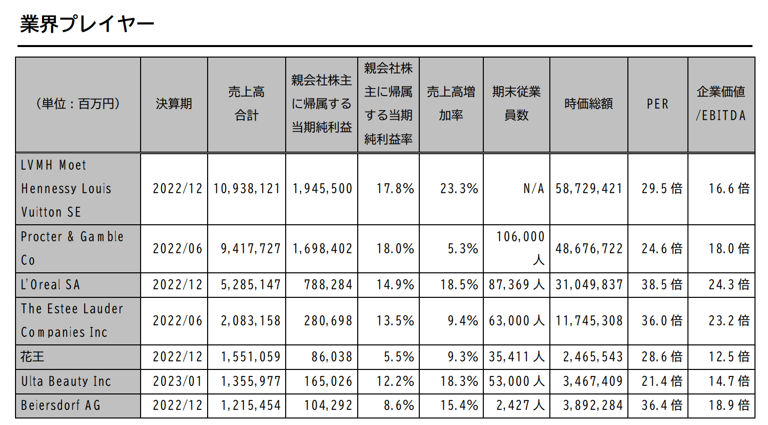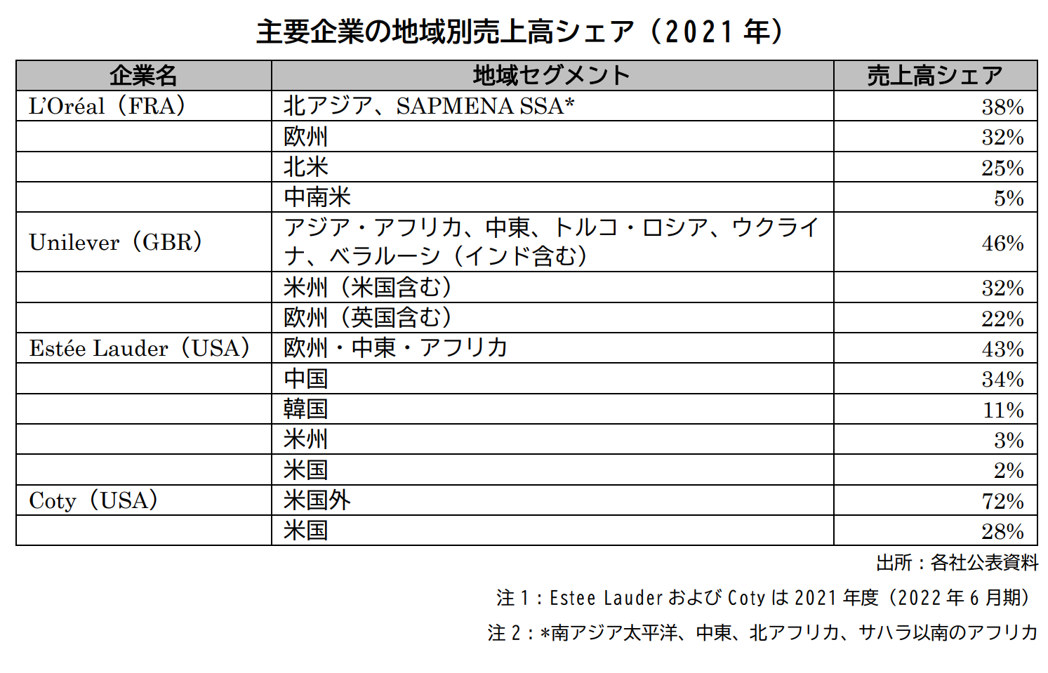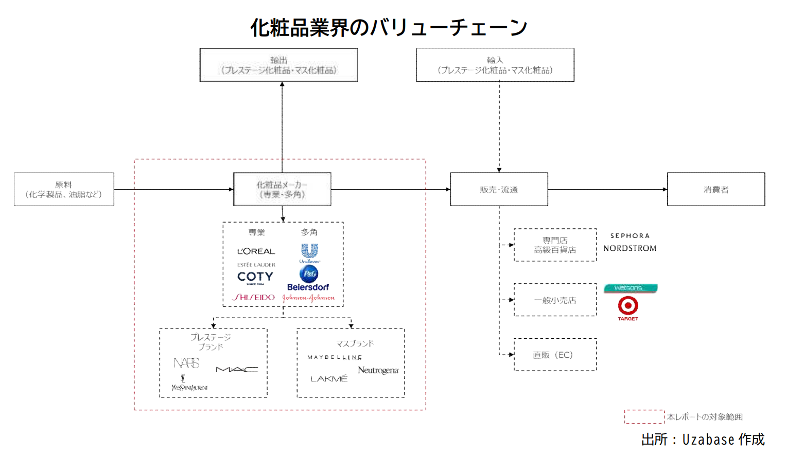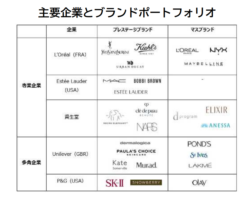 본 산업은 L'Oréal이나 Estée Lauder(미국)와 같이 화장품을 전문적으로 취급하는 사업자와 Unilever(GBR), Proctor & Gamble(미국, 이하 P&G)과 같이 세면도구, 생활용품 등의 제품도 취급하는 다각화된 사업자로 분류된다.