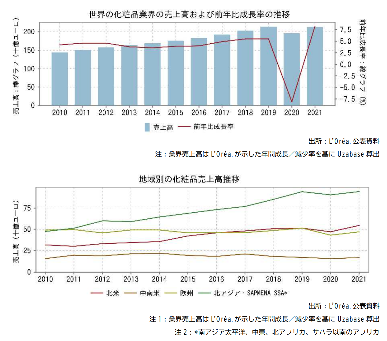 L'Oréal(FRA)에 따르면 세계 화장품 산업은 2021년 기준 약 2,510억 달러(약 2,130억 유로) 규모이며, 개인의 외모를 가꾸는 스킨케어 제품, 메이크업 제품, 향수 등을 폭넓게 취급한다.