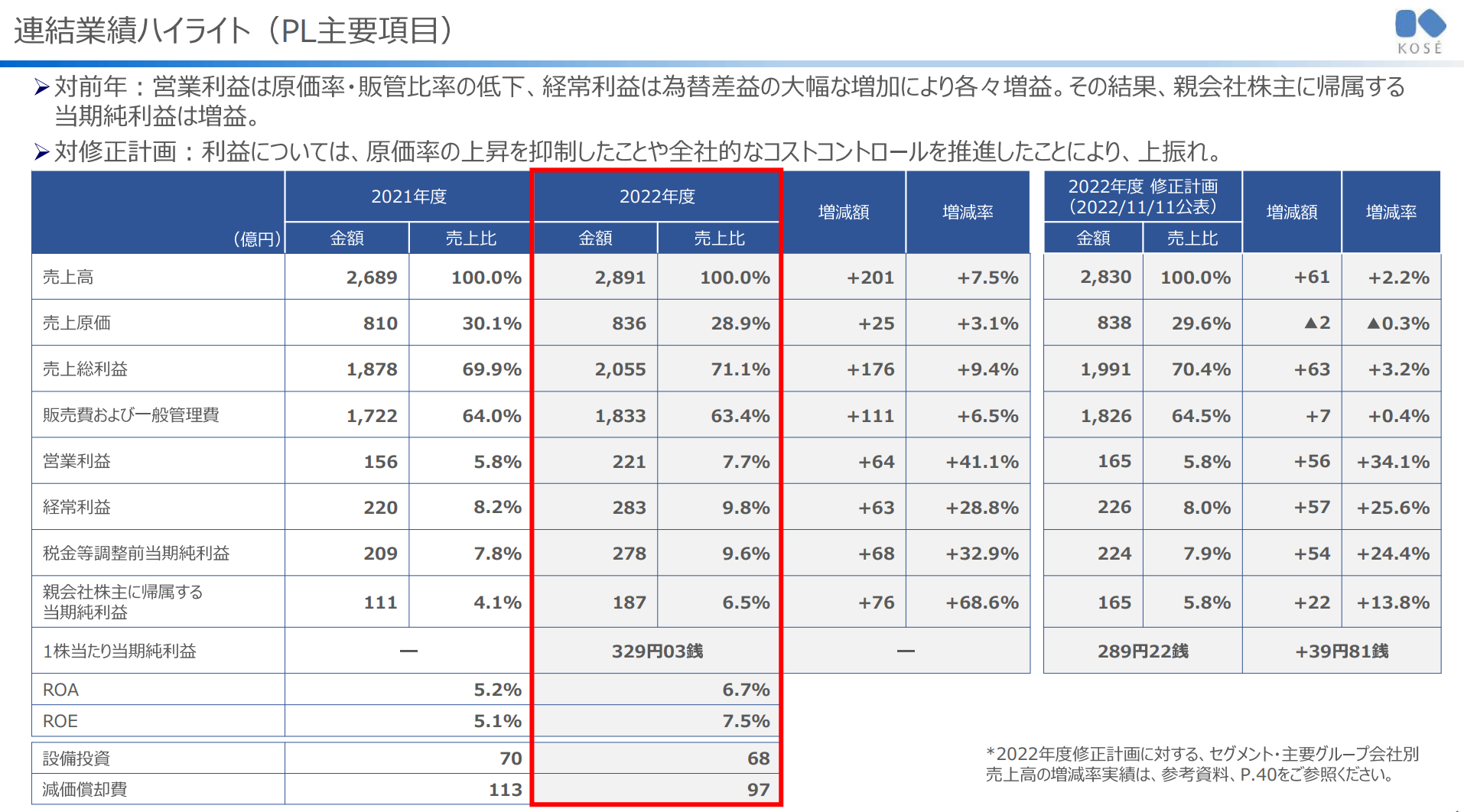 - 전년비 : 증수에 더해, 원가율의 저감 및 판관비의 억제를 추진한 결과 증익