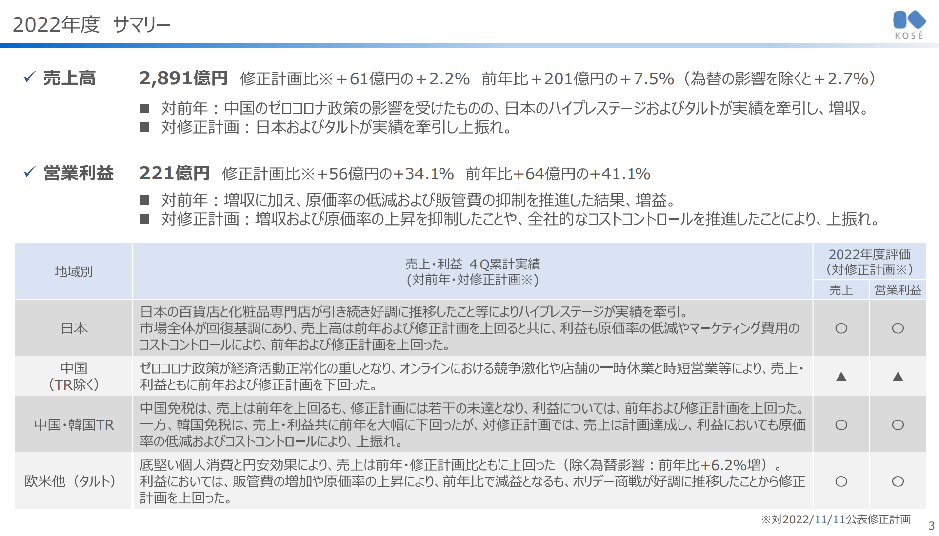 | 전체 | - Holiday 상전은 전년을 상회하는 실적으로 착지. Gift 상품의 확매 및 SNS에 의한 Promotion에 성공하여, [Holiday Brand]로서 존재감이 향상 - Concealer∙Mascara 등의 주요 Category가 지속적으로 높은 Share를 유지 - Lip Category에서는 [maracuja juicy lip] Series의 매출이 신장 - 2022년도의 신규 출점이 순조롭게 확대 |