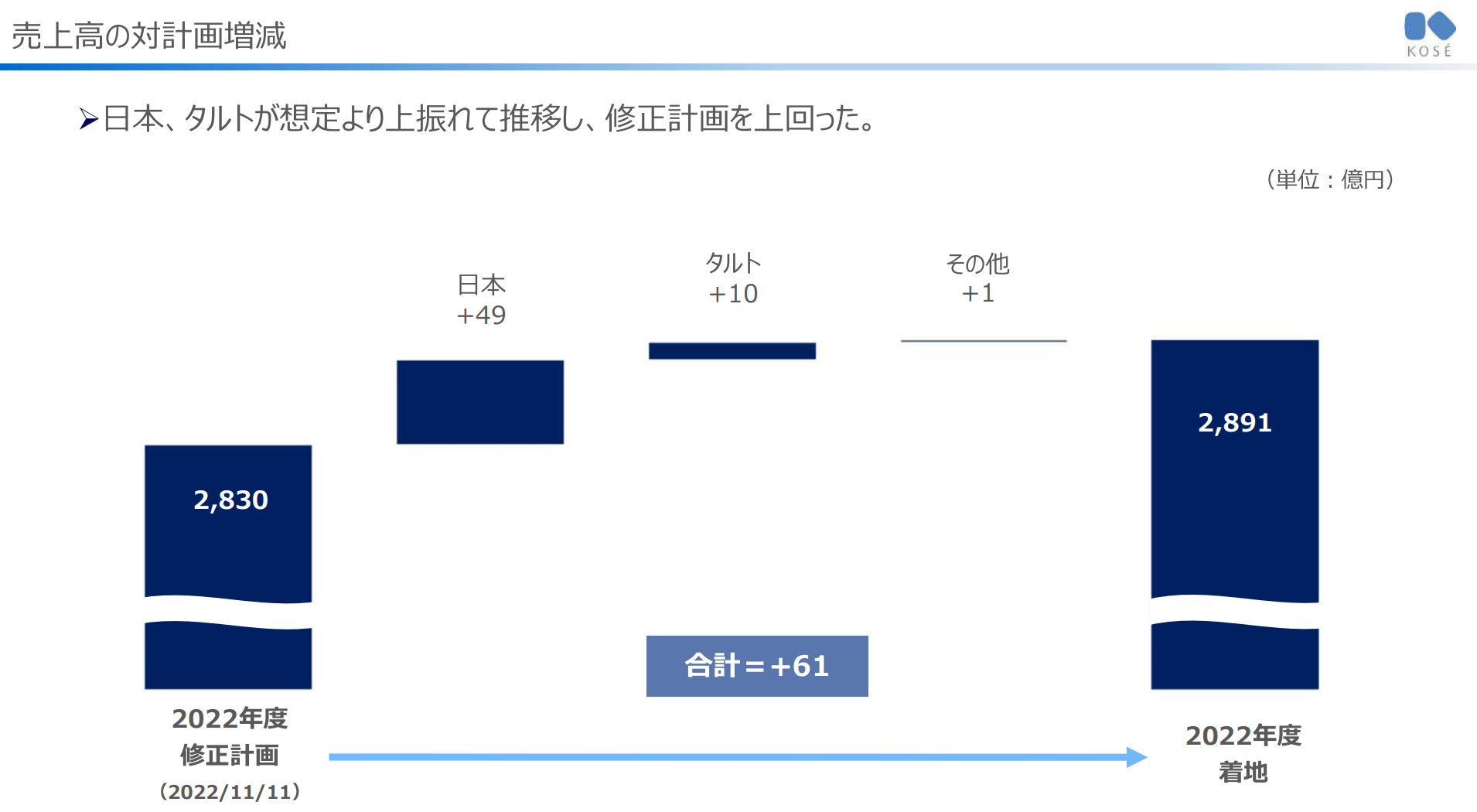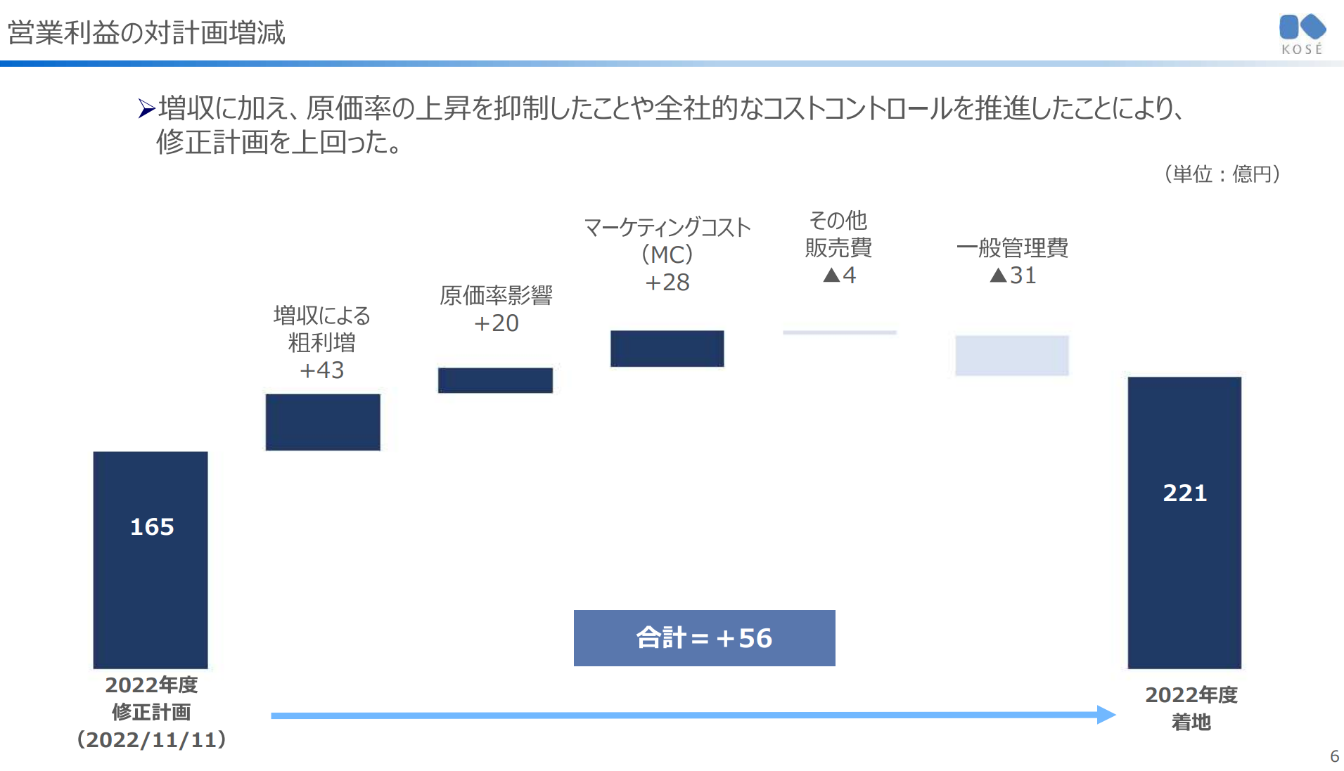 증수에 더해, 원가율의 상승을 억제한 것 및 전사적인 Cost Control을 추진한 것에 의해 수정계획을 상회함