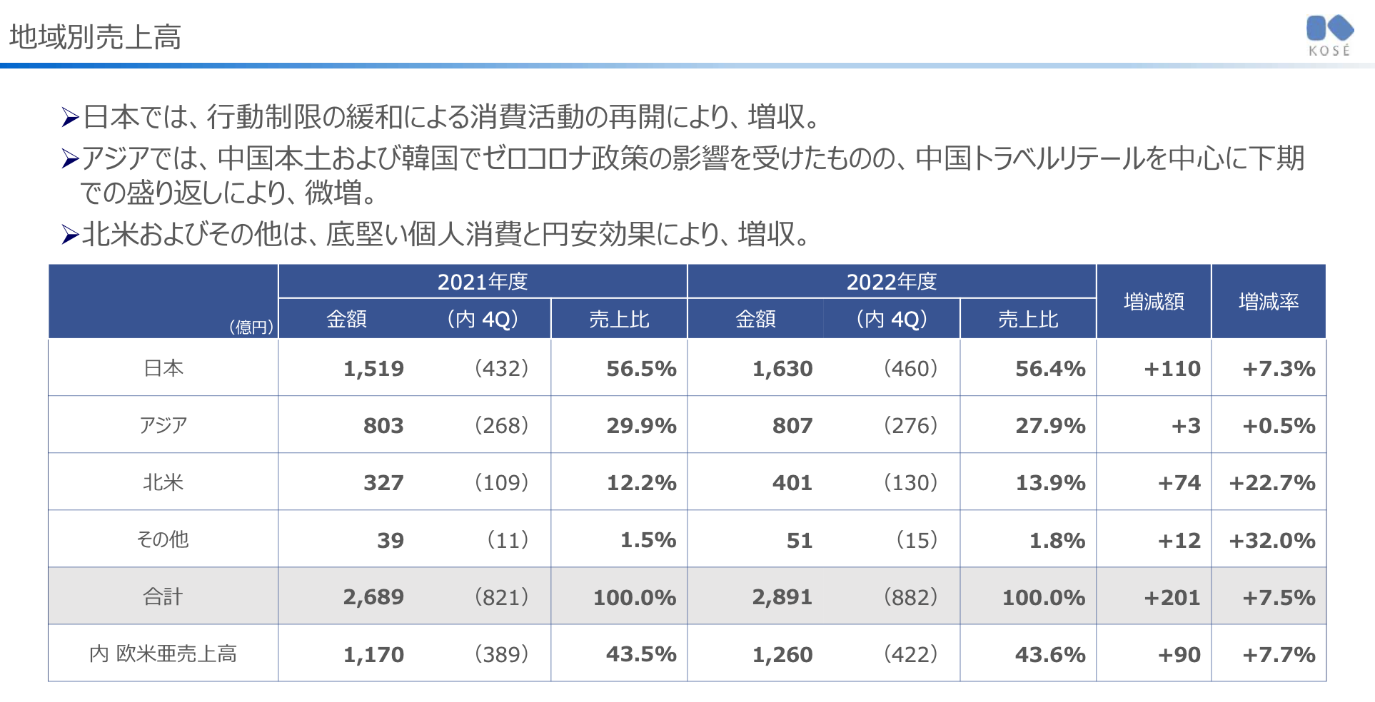 - 아시아에서는, 중국 본토 및 한국에서 제로 코로나 정책의 영향을 받았으나, 중국 Travel Retail을 중심으로 하반기에서 반등에 의해, 소폭 증가