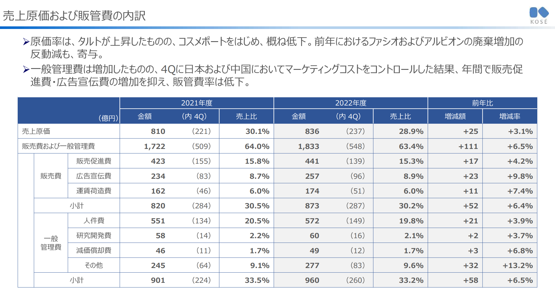 - 일반관리비는 증가했으나, 4Q에 일본 및 중국에 있어서 Marketing Cost를 Control 한 결과, 연간으로 판매판촉비·광고선전비의 증가를 억제하여, 판관비율은 저하