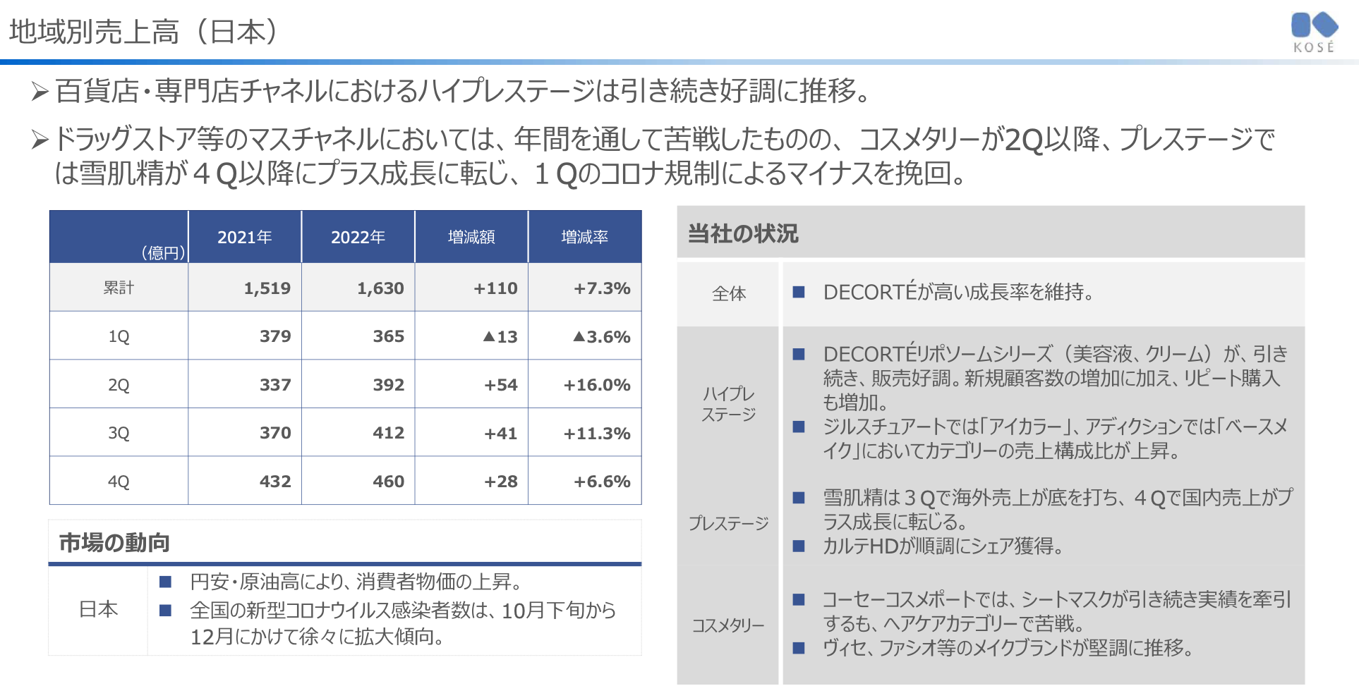- Drug Store 등의 Mass Channel에 있어서는, 연간을 통해서 고전했으나, Cosmetaries가 2Q 이후, Prestige에서는 SEKKISEI가 4Q 이후에 PLUS 성장으로 전환, 1Q의 코로나 규제에 의한 MINUS를 만회