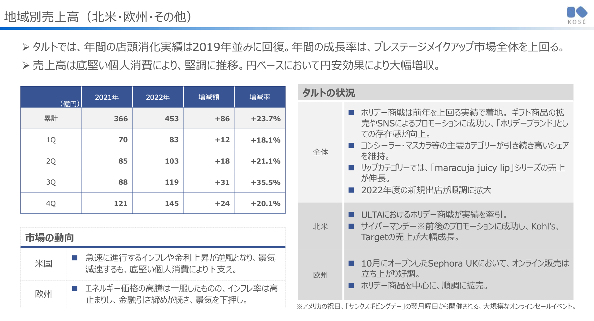 | 북미 | - 급속히 진행하는 Infla 및 금리 상승이 역풍으로 되어, 경기 감속하지만, 견조한 개인 소비에 의해 지지 | - ULTA에 있어서 Holiday 상전이 실적을 견인 - Cyber Monday ※ 전후의 Promotion에 성공하여, Kohl's, Target의 매출이 대폭 성장 |