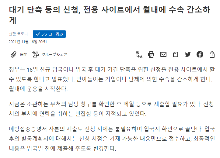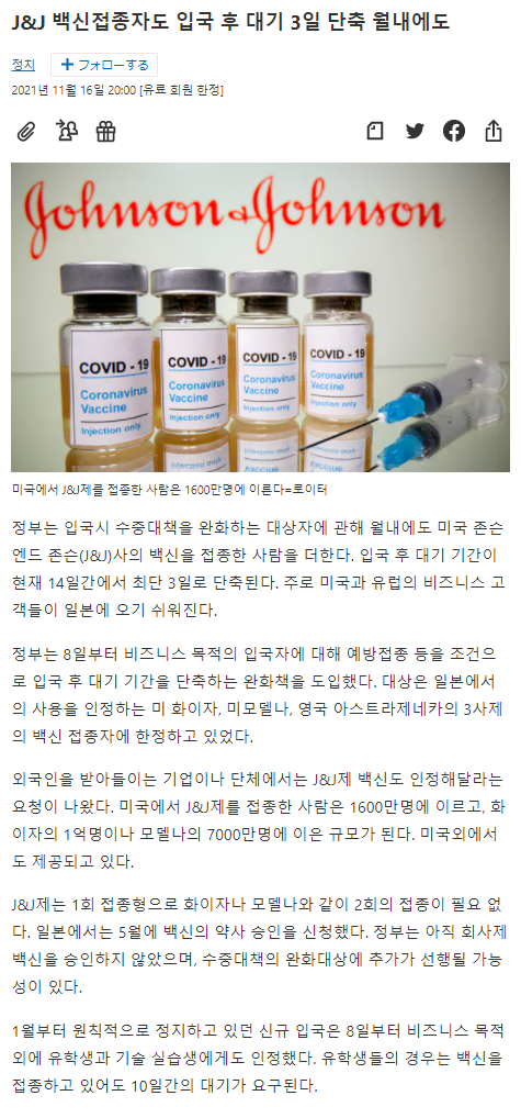 얀센러들은 일본에서 미접종자의 신분으로 살아야하는 것인가라고 슬퍼하고 있는 와중에 아래와 같은 기사가 떡하니 떳다.