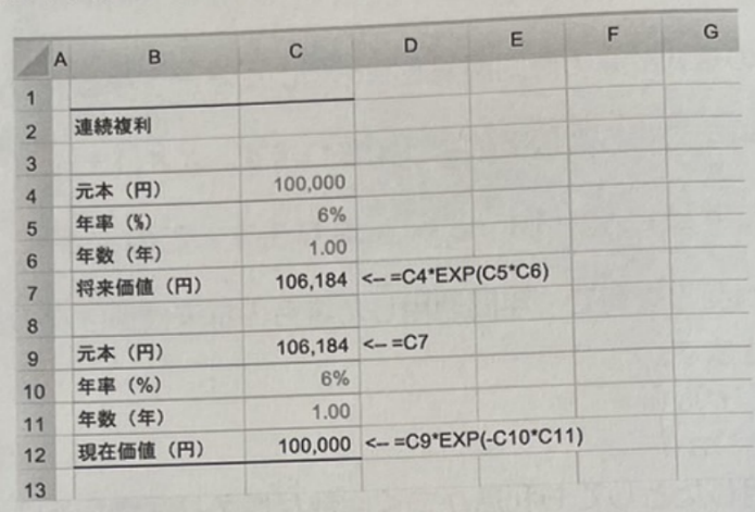 실제 Excel에서 연속복리를 계산하는 경우에는 아래와 같이 EXP 함수를 사용하면 되어 간단하다.