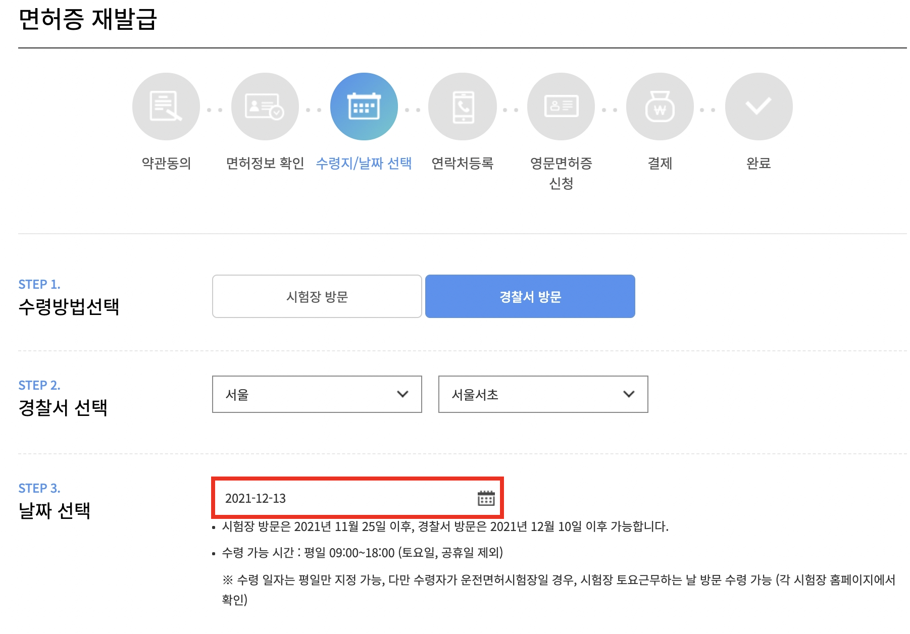 약관동의 -> 면허정보 확인 -> 수령지/날짜 선택을 해보니