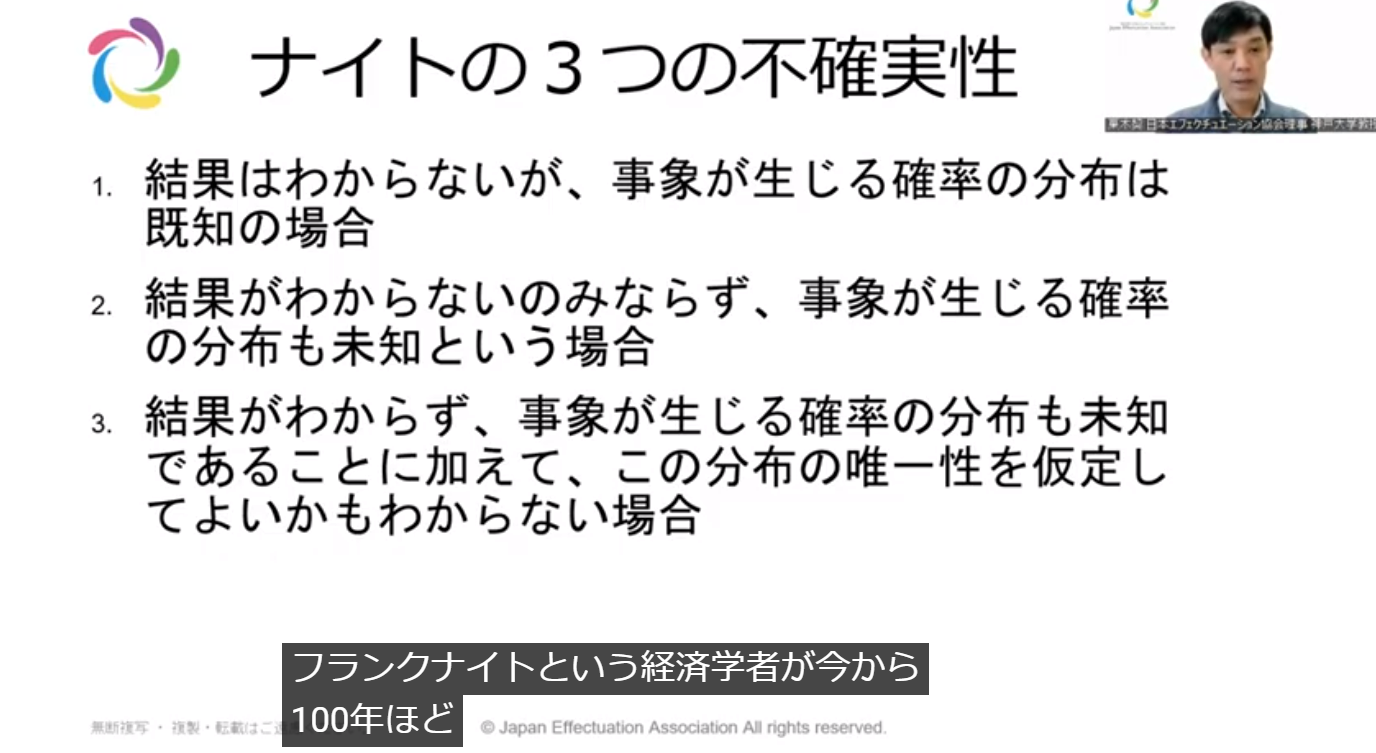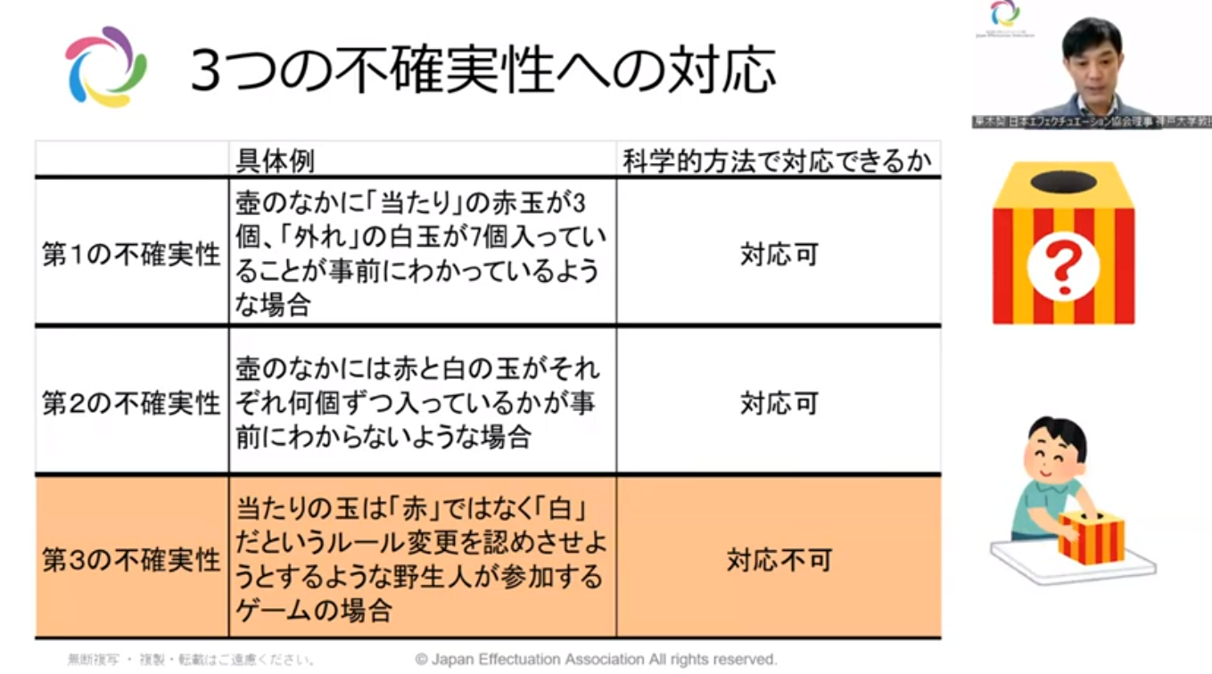 | 제1의 불확실성 | 상자 안에 [당첨]의 빨간구슬이 3개, [꽝]의 하얀구슬이 7개 들어있는 것이 사전에 알고 있는 경우 | 대응 가능 | ||