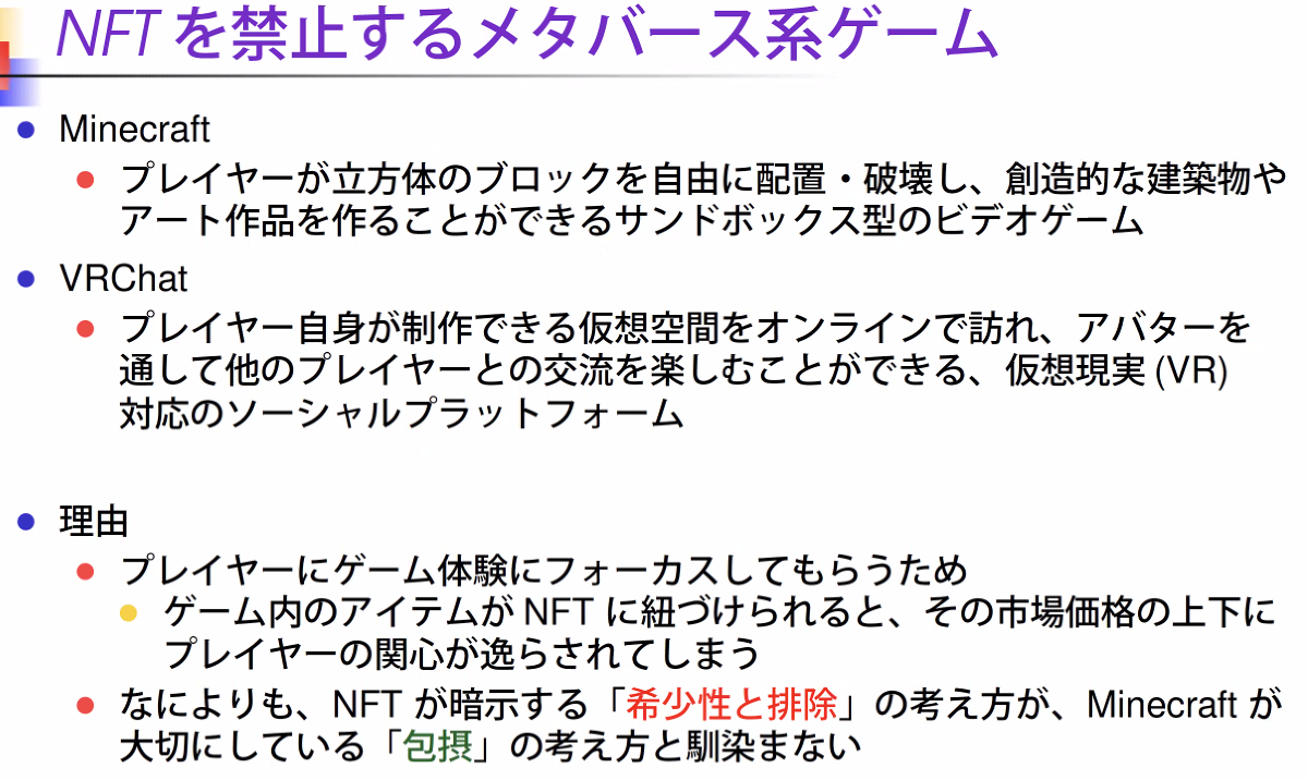 - 무엇보다도, NFT가 암시하는 [희소성과 배제]의 생각이, Minecraft가 중요시하는 [포섭]의 사고와 익숙하지 않다