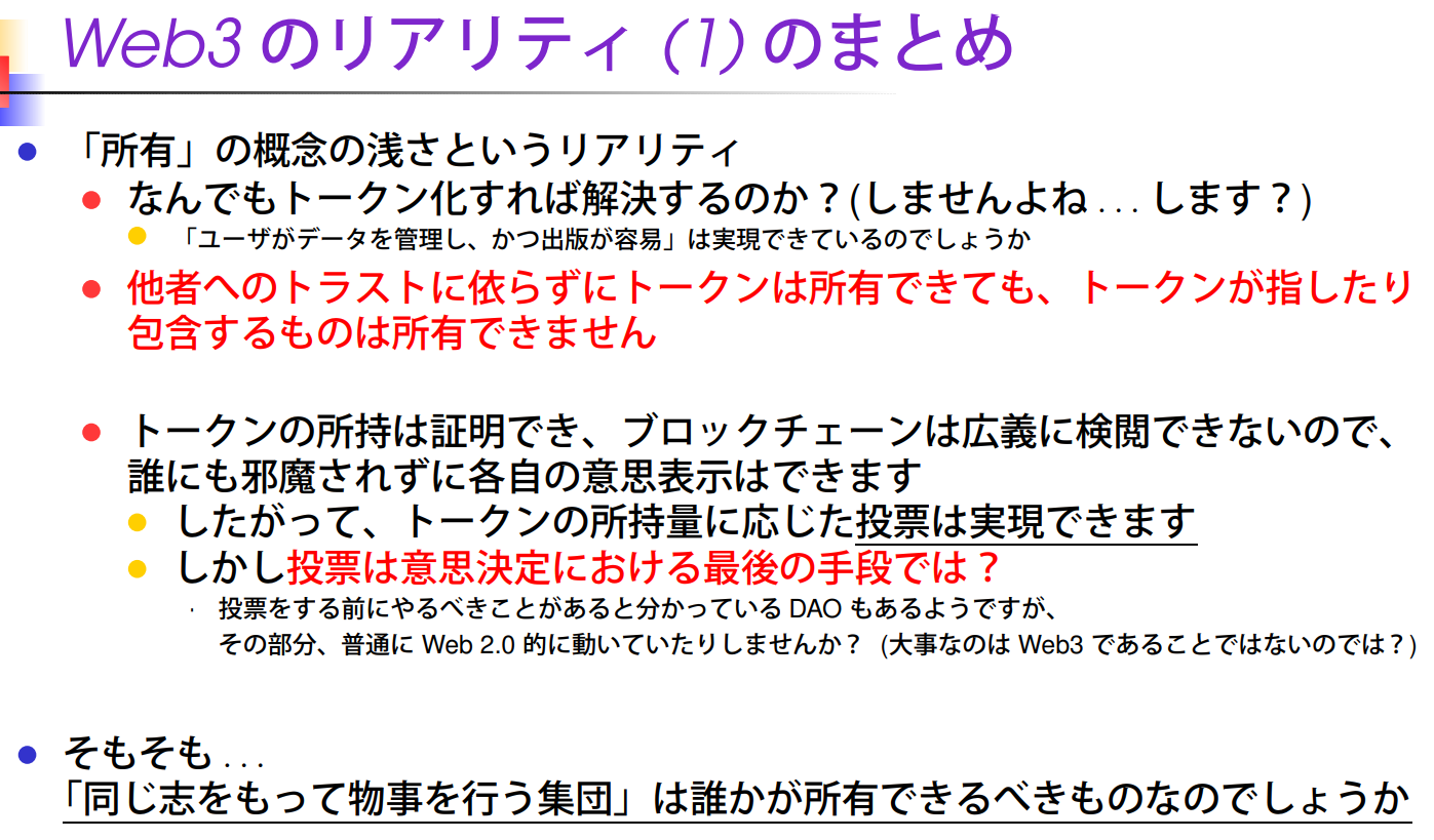 Token이 가리키거나 포함하는 것은 소유할 수 없다. - Token의 소유는 증명할 수 있고, Blockchain은 광의의 의미에서 검열할 수 없기 때문에,