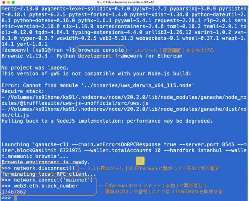 'demoenv'라는 이름으로 만들고, Python을 이용한 Ethereum Smart Contract 개발 환경인 brownie를 설치했습니다.