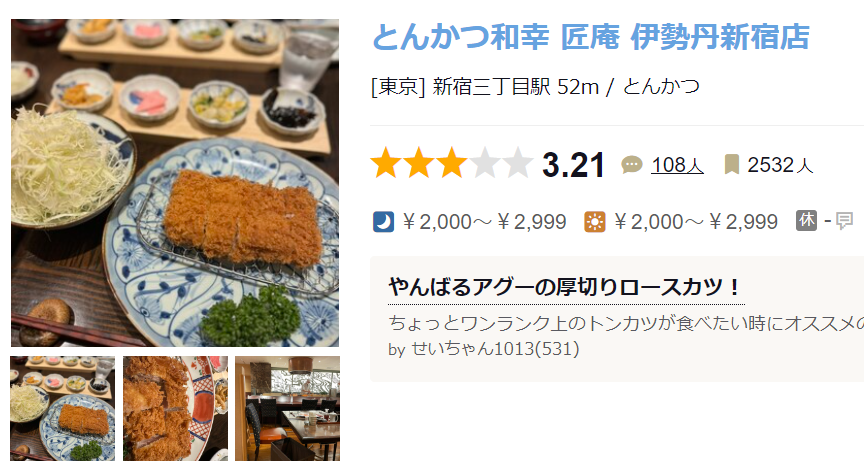 구글 평점 4.1점 매우 훌륭하다. 돈카츠 야마사키 · 〒162-0065 Tokyo, Shinjuku City, Sumiyoshicho, 6−10 小松ビル 1F ★★★★☆ · 돈까스 전문식당 www.google.com 타베로그 평점 3.47 매우 높다. 타베로그는 일
