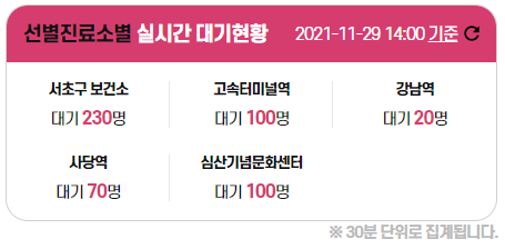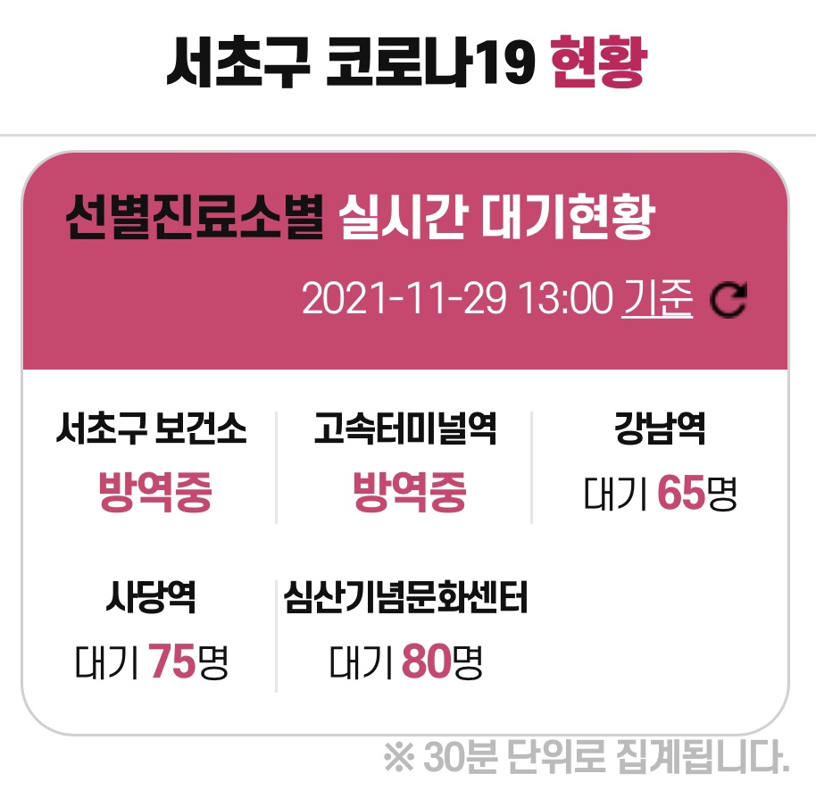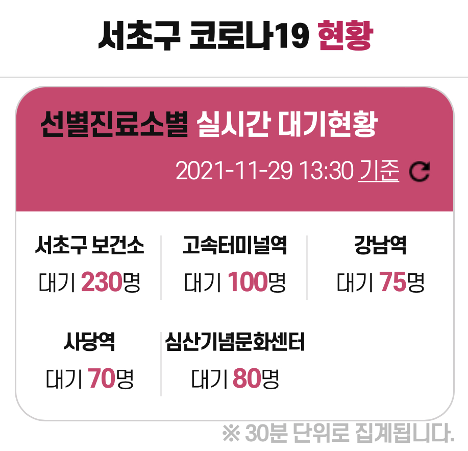 우선 서초구청피셜로는 '21.11.29일 기준 선별진료소는 총 5곳이 있다.