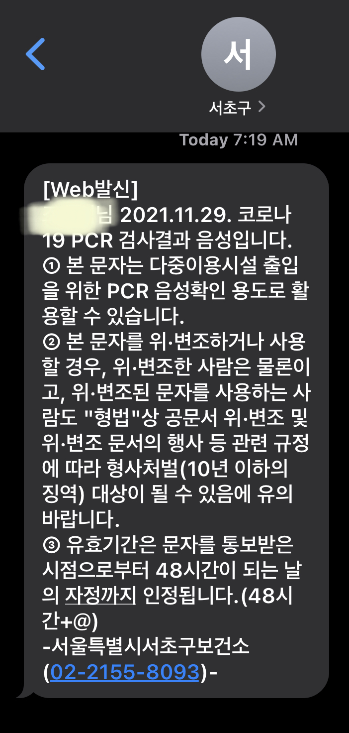 다음날 오전 7시 19분에 코로나 음성이라는 문자가 왔다.