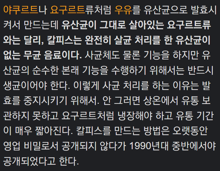 칼피스는 완전한 살균처리를 한 유산균이 없는 무균 음료라고 한다.
