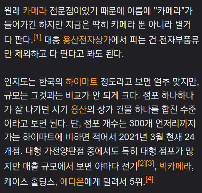 시간이 지나면서 대부분 빅꾸 카메라나 야마다 덴끼가 전국적으로 크다는 사실을 알게 되었다.