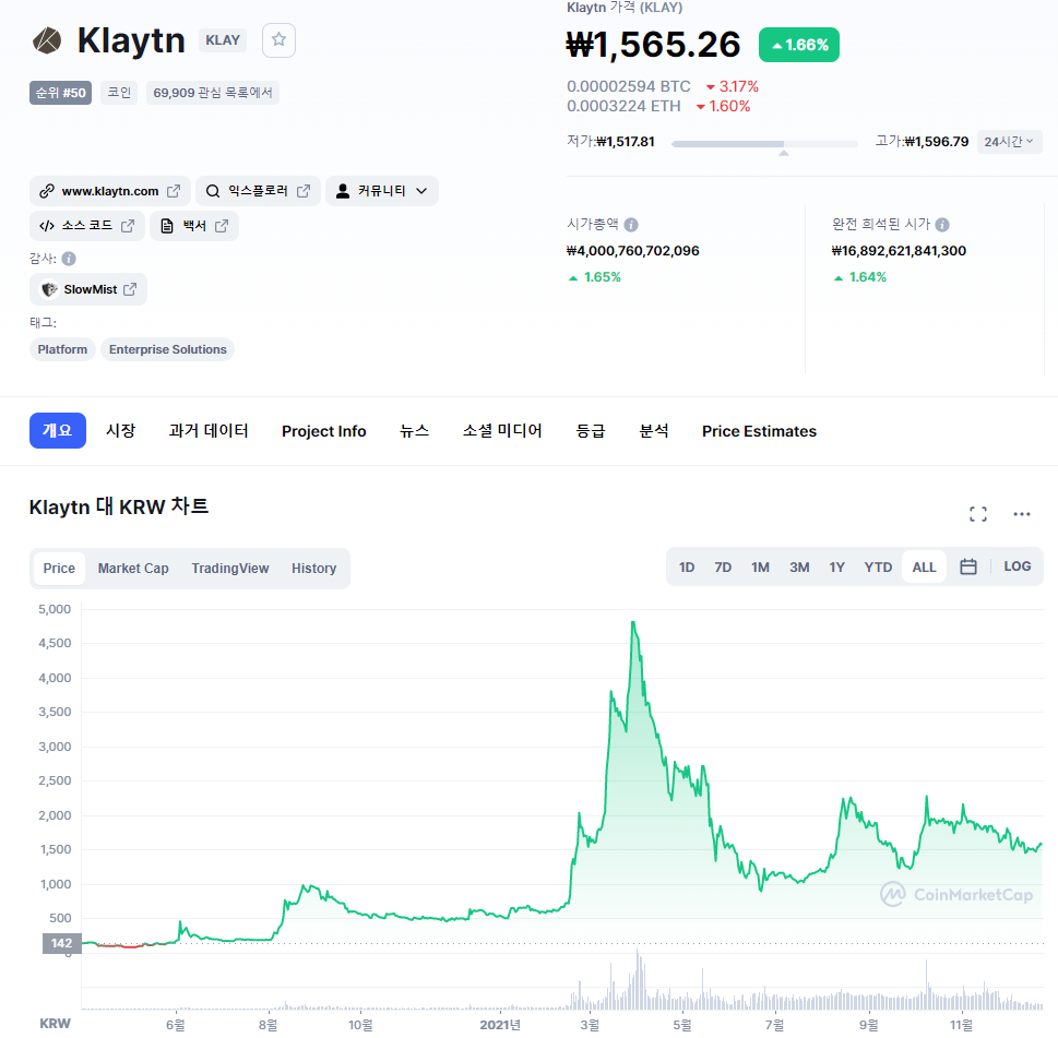 '21.12.24일 기준 클레이튼(KLAY)의 시가총액은 약 4조원, 가격은 1개당 1,500원