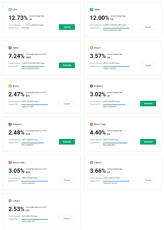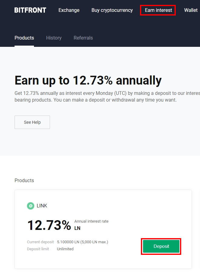 Bitfront 거래소에서는 LINK를 적금 가입 식으로 Deposit을 할 경우 연 12.73%의 이자를 코인으로 준다.