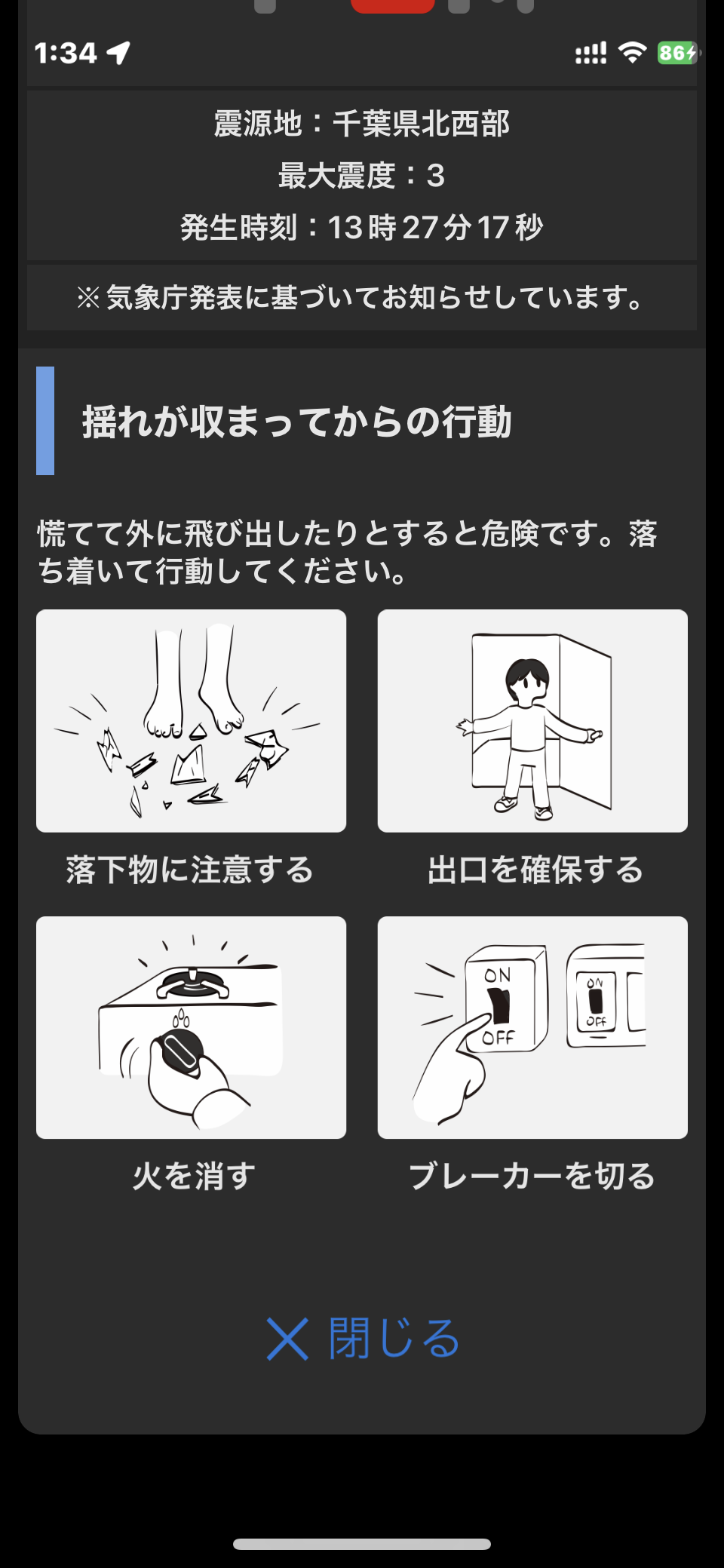 緊急地震速報や津波、避難情報、大雨による災害などさまざまな防災情報をプッシュ通知で受け取れるほか、災害マップや防災手帳など、災害に備えるコンテンツを確認できる無料のスマー