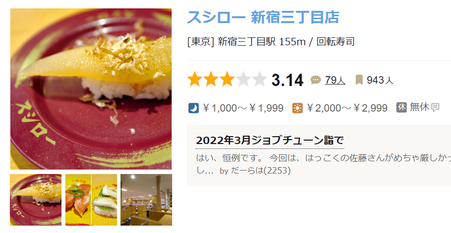 평점 3.8점.. 스시로 우에노점 · 일본 〒110-0005 Tokyo, Taito City, Ueno, 6 Chome−9−9 オリエンタルビル B1 ★★★★☆ · 회전초밥집 www.google.com 타베로그는 3.1점.. 프랜차이즈 치고는 선방.. スシロー 上