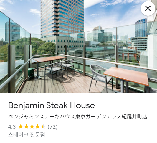 - 분위기 & 위치: 도쿄 가든 테라스 기오이초 4층에 위치한 뉴욕 정통 스테이크 하우스로, 탁 트인 도심 뷰가 보이는 테라스와 고급스러운 인테리어 덕분에 비즈니스 미팅이나 특별한 날 방문하기 완벽한 곳입니다.