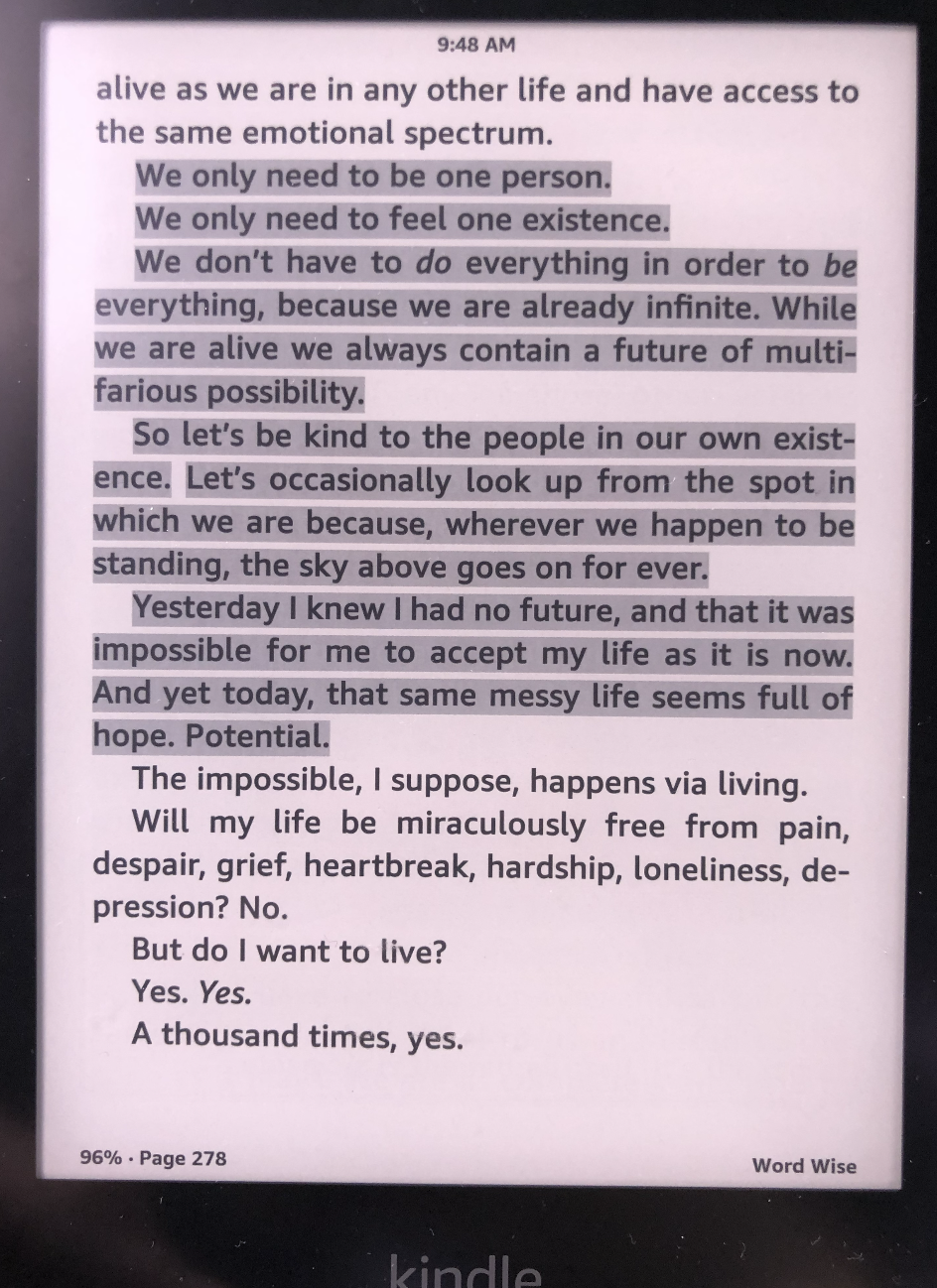 She no longer felt like she had to find sole fulfilment as some imaginary perfect dauter or sister or partner or wife or mother or employee or anything other than a human being, orbiting her own purpose, and answerable to herself.