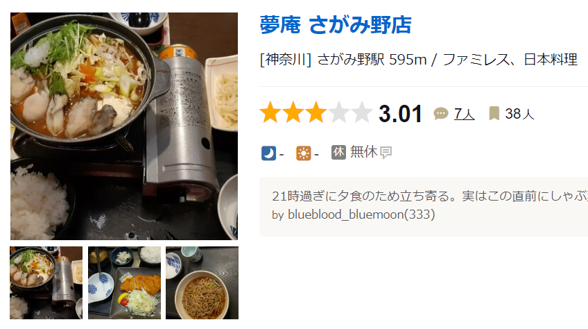 구글 평점은 3.5점 쏘쏘하다 유메안 · 9 Chome-2-33 Minamikoyasu, Kimitsu, Chiba 299-1162 일본 ★★★★☆ · 일본 음식점 www.google.com 타베로그는 3.01점... 타베로그는 항상 이모냥이다.. ㅋㅋ 夢庵 君津店 (君
