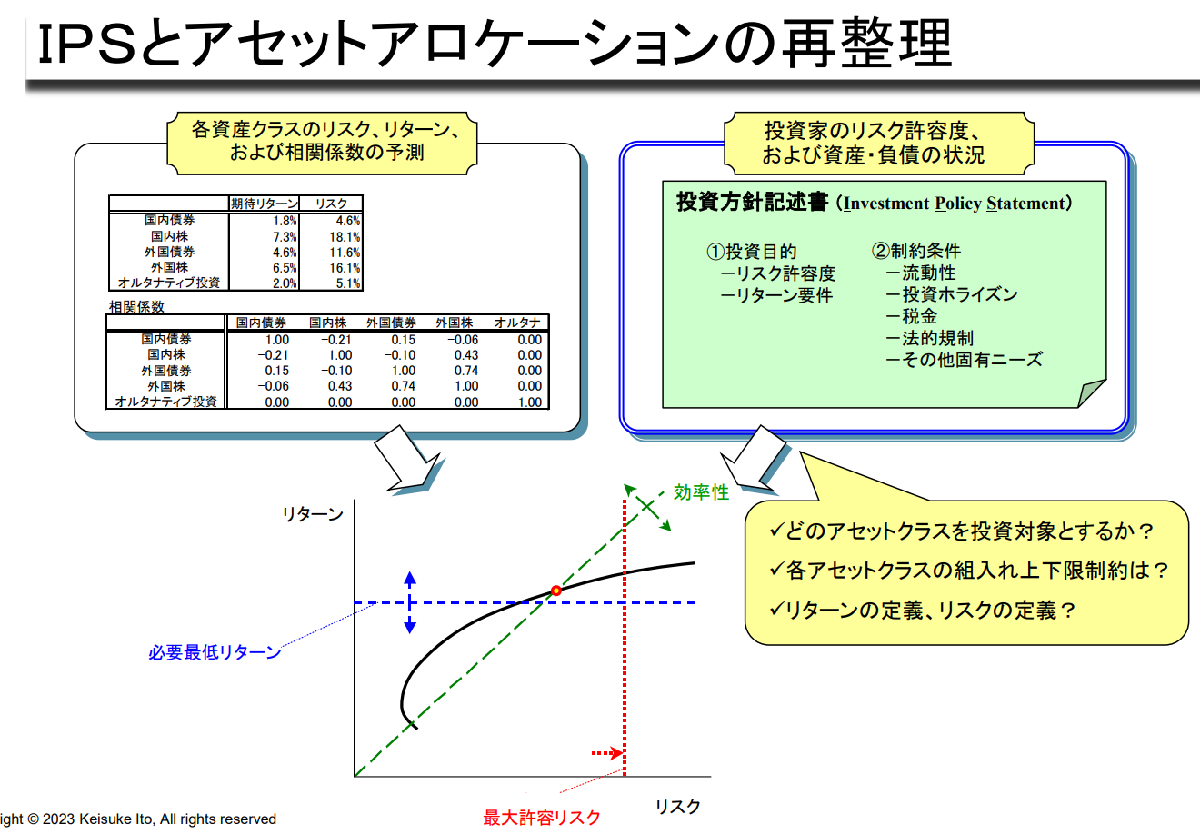 - 수익률 요구사항(Return Objective) - 제약조건(Constraints)