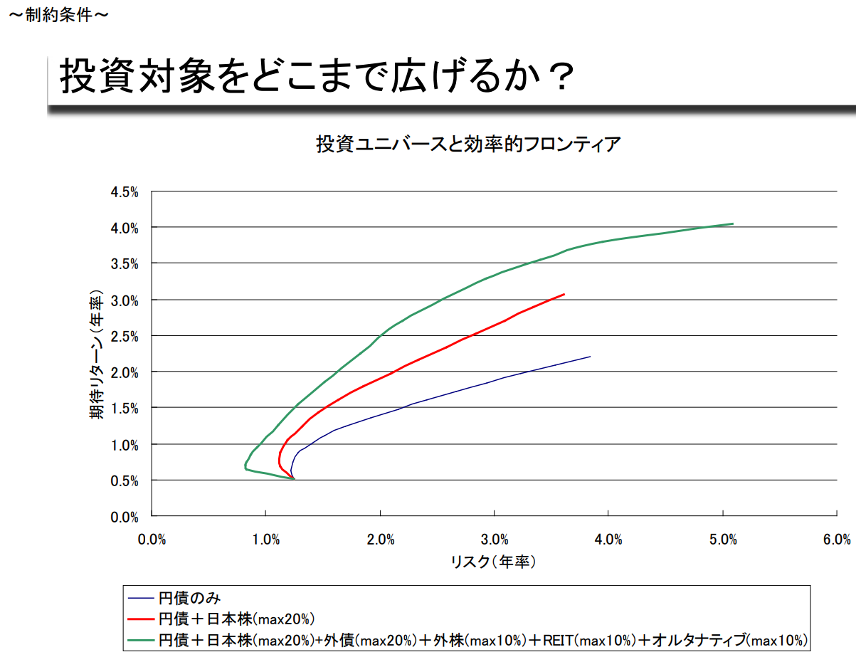 ABC상사의 사장으로 취임한 아베는 회사 기업연금기금의 자산이 모두 만기 10년 이내의 국채에 투자되어 있다는 사실을 알게 되었다. 아베 씨는 '채권을 보유하는 것만으로는 효율성이 너무 떨어진다', '기금의 위험 허용치를 명확히 하고 그 범위 내에서 최대의 수익을 낼 수 있도록 운용해야 한다'고 생각하여 XYZ투자자문사의 포트폴리오 매니저인 당신에게 조언을 구했다.
