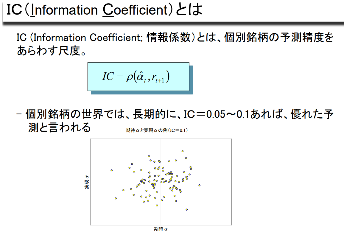 IC(Information Coefficient; 정보계수)는 개별 종목의 예측 정확도를 나타내는 척도이다.