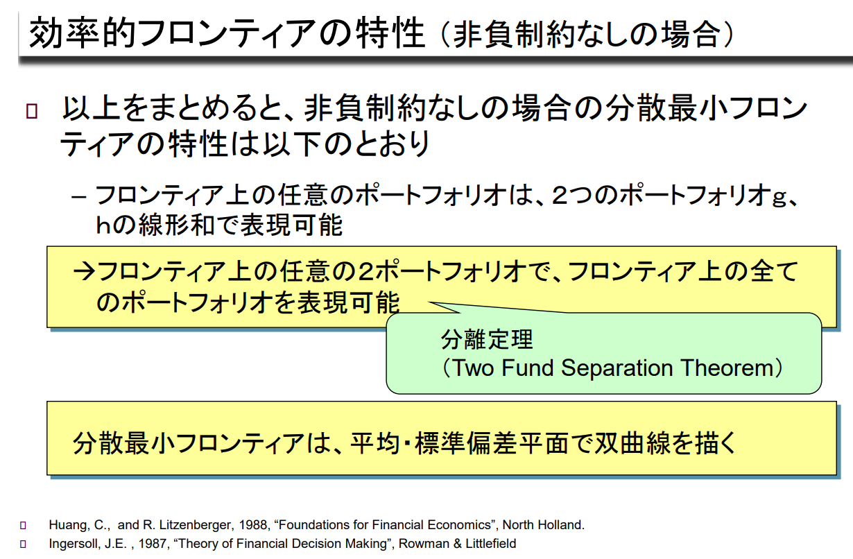 이상을 정리하면, 비부정 제약이 없는 경우 분산 최소 Frontier의 특성은 다음과 같다.