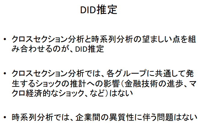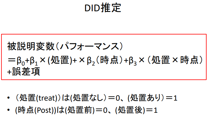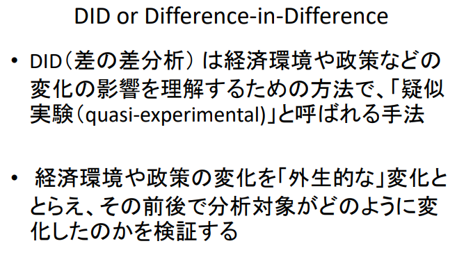 - DID(차이의 차이 분석)은 경제 환경이나 정책 등의 변화의 영향을 이해하기 위한 방법으로