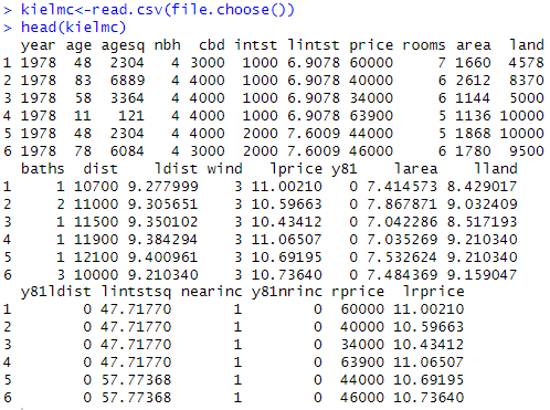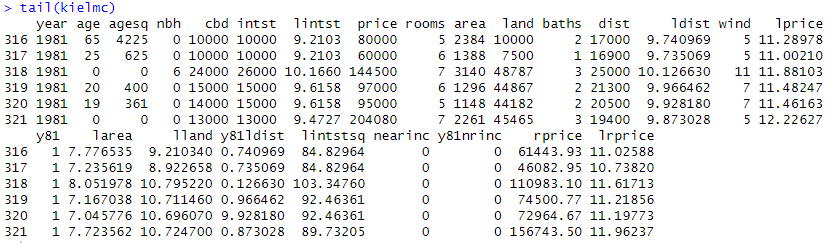 + age + log ( intst ) + log ( land ) + log ( area ) + rooms + baths , data = kielmc )