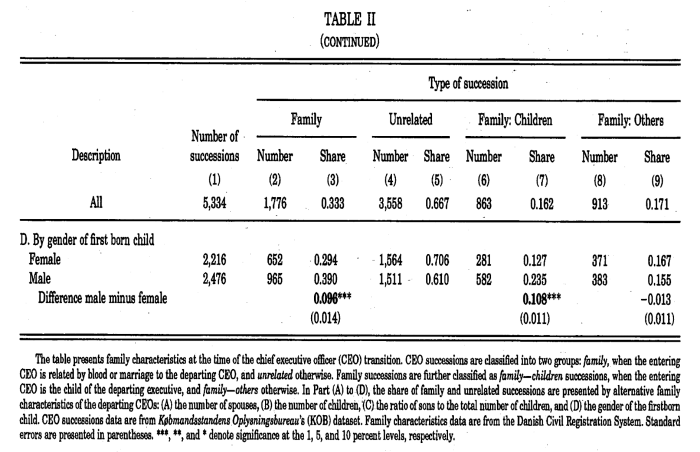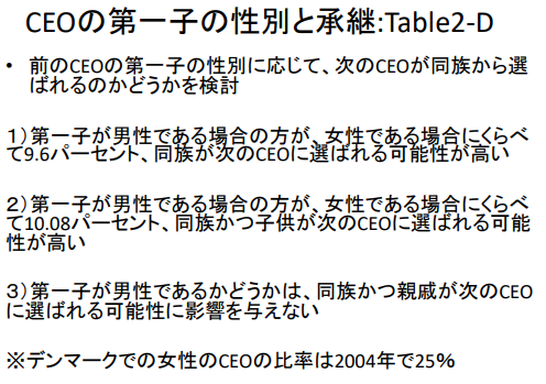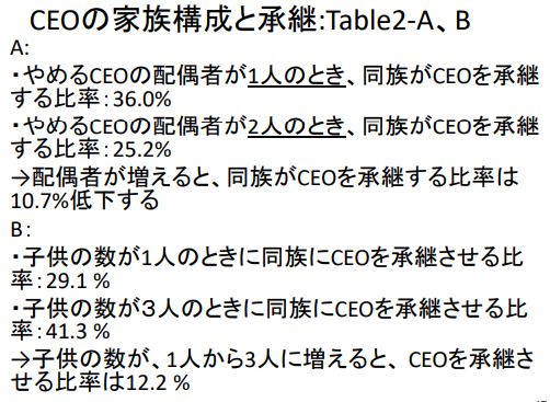 - 첫째 자녀가 남성인 경우 여성인 경우보다 동족이 차기 CEO로 선출될 가능성이 9.6% 더 높음