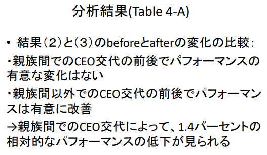 → 친족 간 CEO 교체로 1.4퍼센트의 상대적 성과 감소가 나타남
