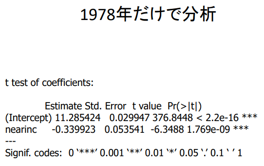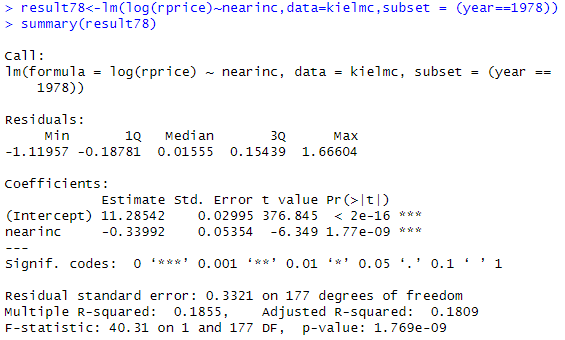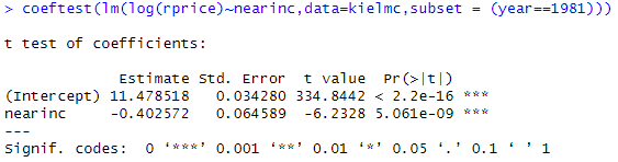 coeftest ( lm ( log ( rprice ) ~ nearinc , data = kielmc , subset = ( year == 1978 ) ) )