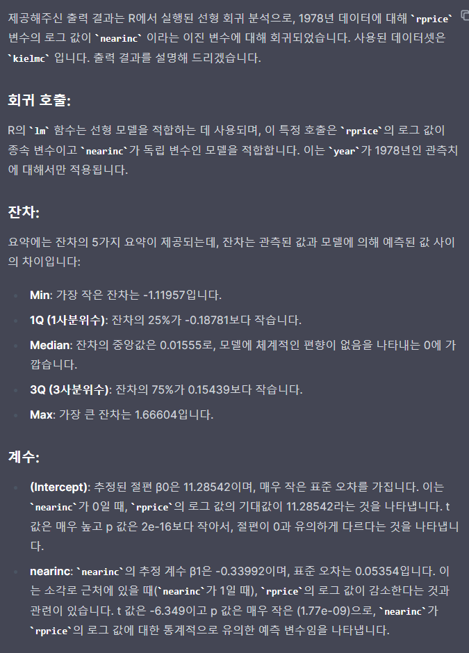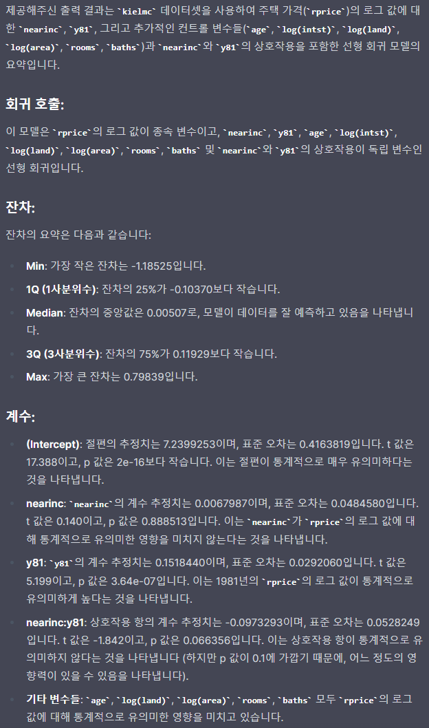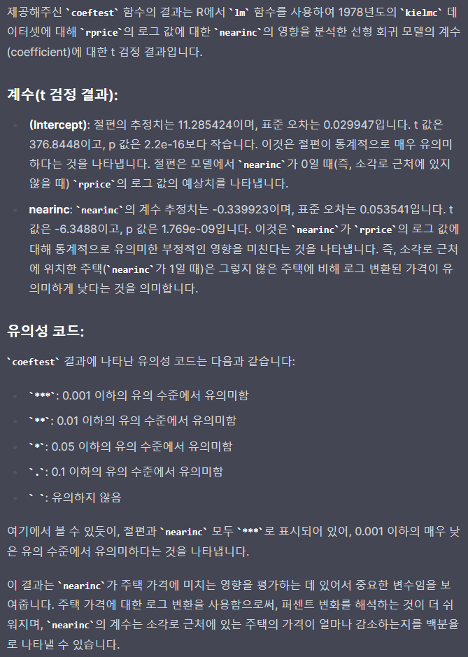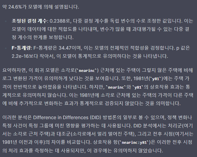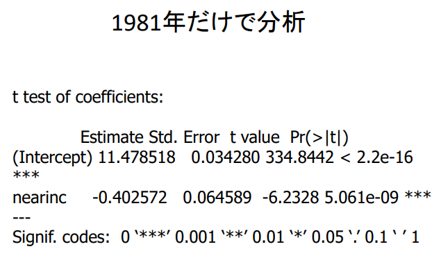 - nearinc*y81 : 유의하게 음(-)의 값 → 1981년 실제 착공 후 가격에 음(-)의 영향을 미침