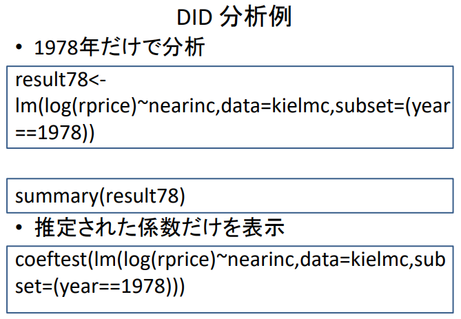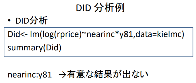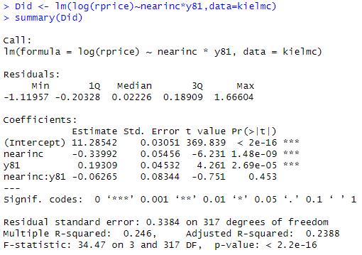 Did <- lm ( log ( rprice ) ~ nearinc * y81 , data = kielmc )