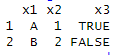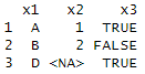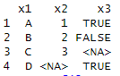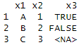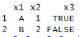 x1 = c ( "A" , "B" , "D" ) , x3 = c ( "TRUE" , "FALSE" , "TRUE" ) )
