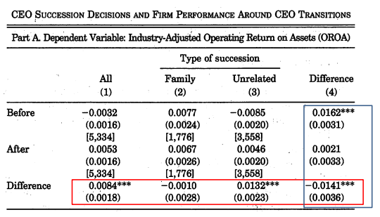 - 친족 간 CEO 교체 전후에 성과는 유의하게 개선됨.